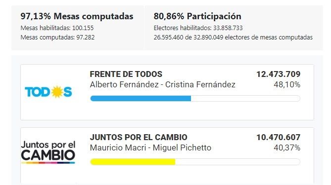 Hasta el momento, el escrutinio provisorio marca que Alberto Fernández – Cristina Fernández alcanzan el 48.10% de los votos por sobre el 40.37% de Mauricio Macri – Miguel Pichetto. De este modo, la diferencia es de casi 8 puntos y menor a lo sucedido en las PASO. Sin embargo, las encuestadoras marcaron distancia mayor.