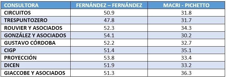Hay que recordar que, para las PASO, las mismas consultoras daban cuenta de una ventaja de Alberto Fernández de entre 2 y 4 puntos. Finalmente la diferencia fue de más de 15 puntos. En la Provincia se preveía una paridad mayor, pero el margen de diferencia terminó siendo de 18 puntos.