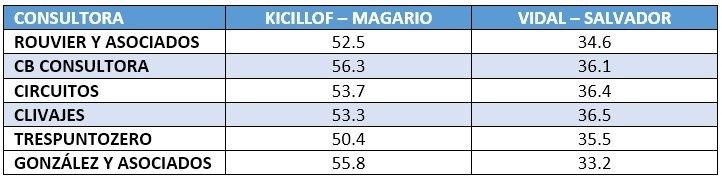 En la provincia de Buenos Aires, el recuento provisorio marca que Axel Kicillof – Verónica Magario obtienen el 52.28% y María Eugenia Vidal – Daniel Salvador el 38.39%. Aquí, los sondeos expresaron números parecidos entre Kicillof y Alberto Fernández y que Vidal mejoraba los que ostentaba Mauricio Macri.