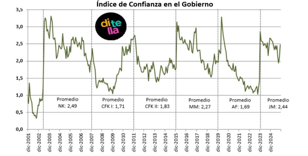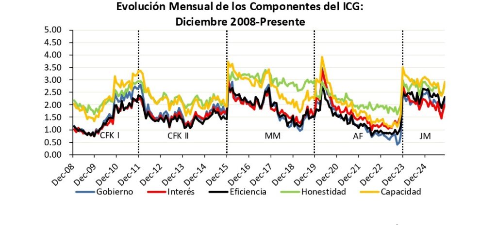 La encuesta telefónica que se hace a mayores de 18 años residentes en ciudades de más de 10 mil habitantes tomó más de 1000 casos consultados entre el 3 y el 13 de noviembre, es decir, pocos días después de los comicios y con el gobierno todavía celebrando. La población se hizo eco de esa victoria incrementando su confianza en la administración libertaria para todos los componentes del índice (gobierno, interés, eficiencia, honestidad y capacidad).