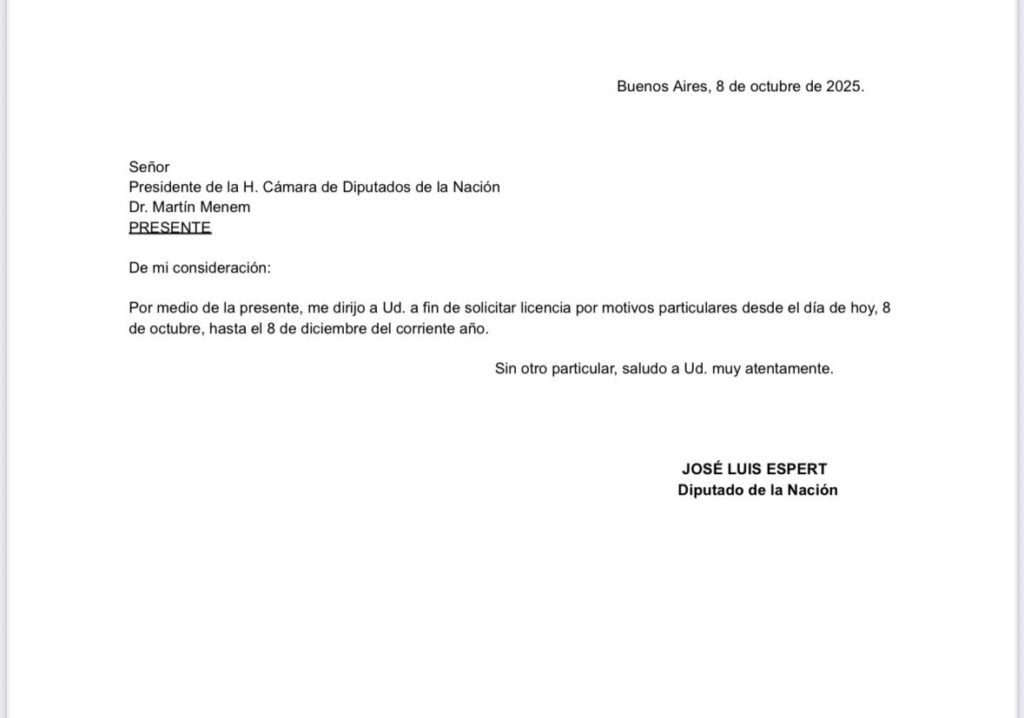 En medio del escándalo judicial que lo vincula con el empresario acusado de narcotráfico Federico “Fred” Machado, el diputado nacional José Luis Espert pidió una licencia “por motivos particulares” que regirá desde este miércoles hasta el 8 de diciembre, apenas dos días antes del final de su mandato. La decisión llega tras su renuncia como candidato principal de La Libertad Avanza en la provincia de Buenos Aires y a su cargo en la Comisión de Presupuesto y Hacienda.