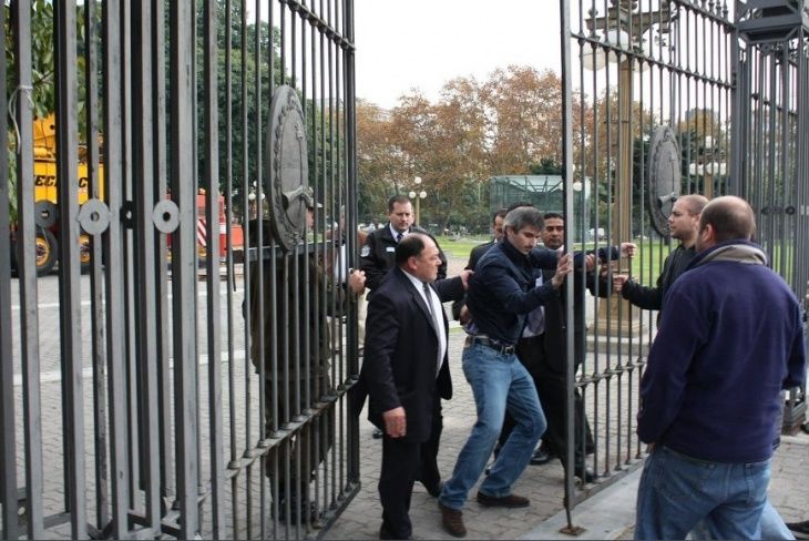 Insausti ingresando por la fuerza en la Casa Rosada el 31 de mayo de 2013 para treparse y abrazarse al Monumento a Cristóbal Colón. Fue detenido por la guardia presidencial que luego confirmó su estado de ebriedad.