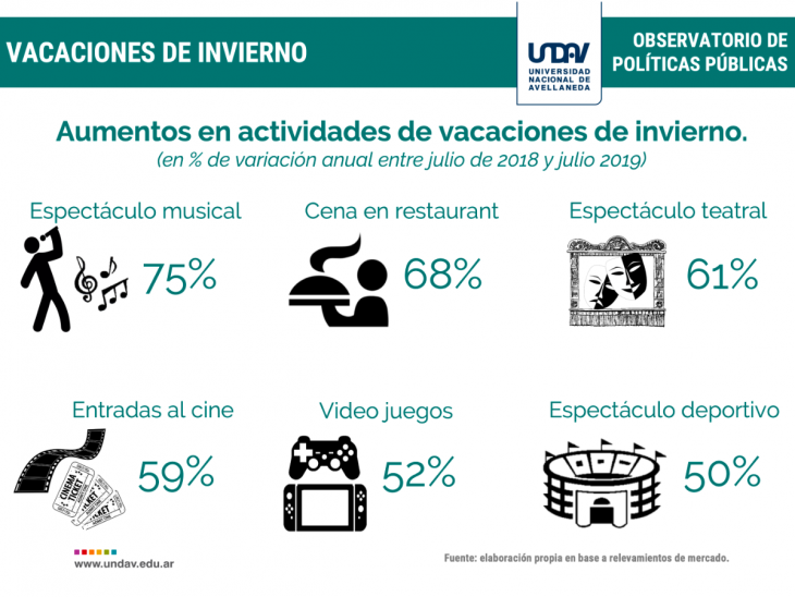 El Observatorio de Políticas Públicas de la Universidad Nacional de Avellaneda (UNDAV) dio a conocer que la canasta turística para las vacaciones de invierno aumentó un 67% en el último año. En el detalle, se ven incrementos del 75% para espectáculos musicales, 68% para una cena en restaurant, 61% en espectáculos teatrales, 59% las entradas de cine, 52% en videojuegos, y 50% para espectáculos deportivos.