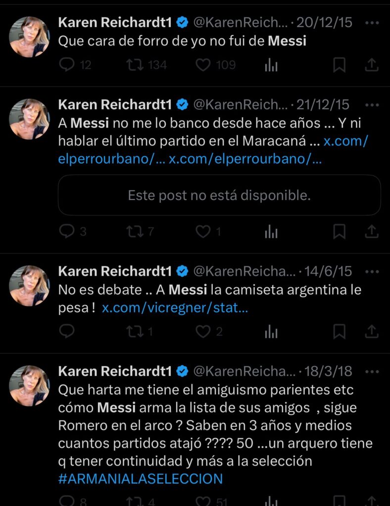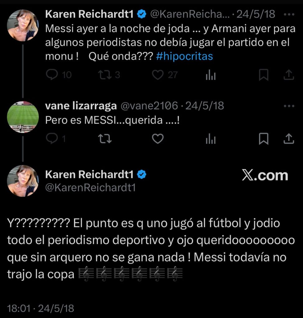 En los archivos delex Twitter, ahora llamado X, quedaron registradas perlas dignas de antología. “Messi put* solo hacés goles en esa mierda de club”, escribió en 2015, enojada porque el rosarino le había convertido a River en el Mundial de Clubes. Pero no quedó ahí. También se despachó con un elegante: “Qué cara de forro de yo no fui de Messi”, y sentenció: “A Messi la camiseta argentina le pesa”.