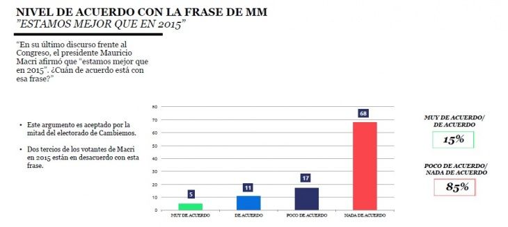 El relevamiento dio a conocer que los argumentos que brinda el gobierno nacional en medio de la profunda crisis económica que atraviesa el país “son aceptados por un tercio del electorado que aprueba la gestión de Mauricio Macri, pero son rechazados por más del 70% de la población y por un porcentaje importante de los votantes que eligieron a Macri en 2015”.