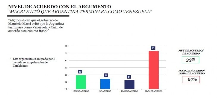 En ese aspecto, lo más creíble del oficialismo es cuando afirma que “Macri evitó que Argentina terminara como Venezuela”, penetrando en 8 de cada 10 votantes de Cambiemos. Sin embargo, la menor credibilidad la logra cuando aseguran que “estamos mejor que en el 2015”, ya que es rechazado por el 66% de las personas que votaron a la actual coalición gobernante en 2015.
