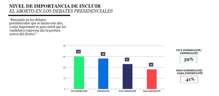 Finalmente, sobre la inclusión del tema aborto seguro, legal y gratuito en el debate presidencial de este año, el 59% expresó que importante incluirlo y el 41% expresó que no lo es. Nuevamente, la discusión en torno a la salud pública se impone por sobre quienes se oponen a la ampliación de derechos de las mujeres y personas gestantes.