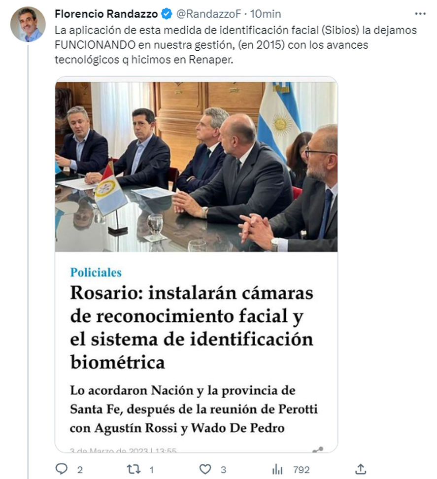 “La aplicación de esta medida de identificación facial (Sibios) la dejamos FUNCIONANDO en nuestra gestión, (en 2015) con los avances tecnológicos q hicimos en Renaper”, twiteó el legislador bonaerense, comentando el anuncio de De Pedro.