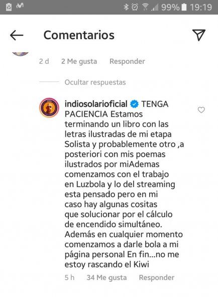 El cantante y compositor Carlos Indio Solari reapareció esta semana en las redes sociales para dejarles una “prueba de vida” a sus seguidores, quienes rápidamente comenzaron a exigirle al ex líder de Patricio Rey y sus Redonditos de Ricota desde que realice un nuevo concierto, aunque sea via streaming, hasta el lanzamiento de nuevo material discográfico. El propio Solari se adueñó del teclado y les dejó una respuesta lapidaria.