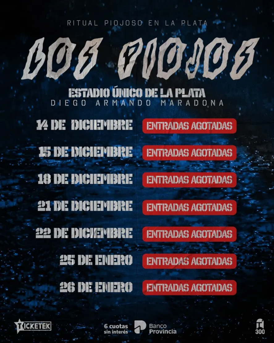 La banda del Palomar dará siete shows en la capital de la provincia de Buenos Aires, los días 14, 15, 18, 21, 22 de diciembre y 25 y 26 de enero de 2025. Las entradas para todas las fechas están agotadas.