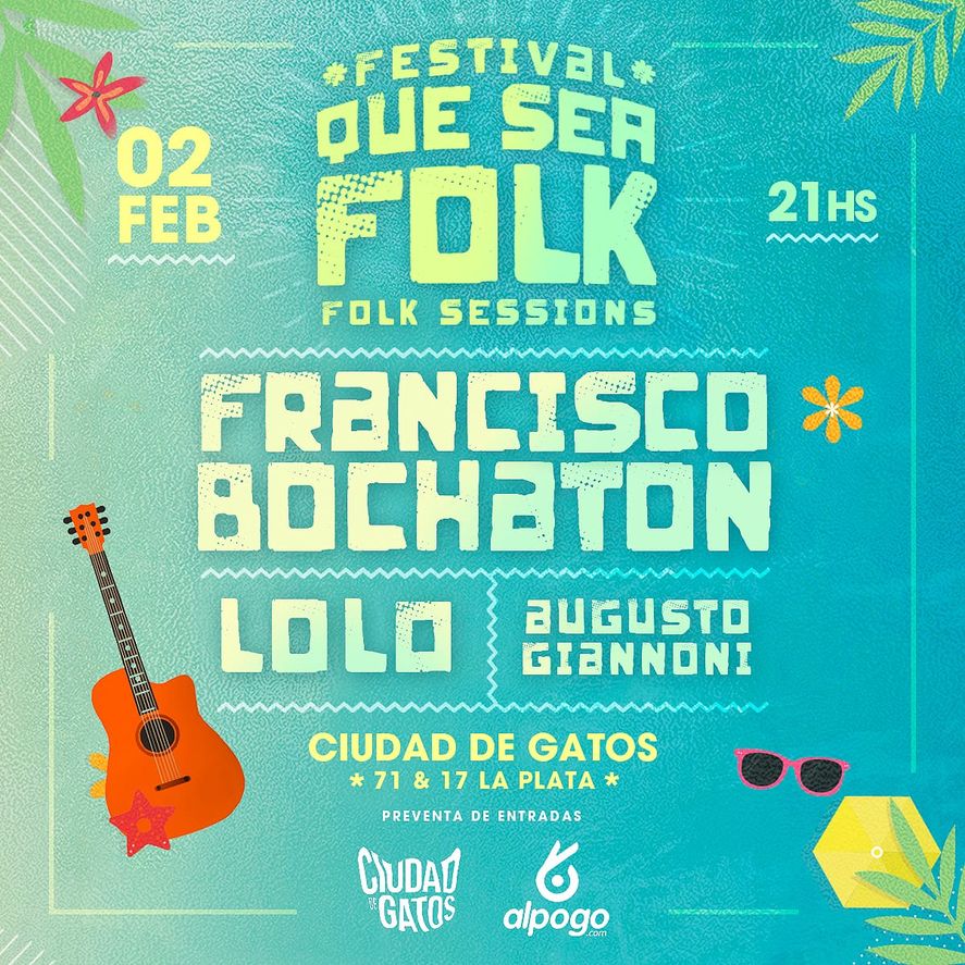 El jueves 2 de febrero a partir de las 21 arranca el Festival “Que sea Folk | Folk sessions. En el que actuaran Augusto Giannoni, Lolo y Francisco Bochaton. El lugar elegido es Ciudad de Gatos (71 y 17) y las entradas se consiguen por sistema en alpogo.