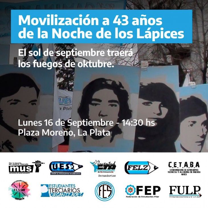Este lunes, a 43 años de La noche de los lápices, concentramos a las 14:30 en Plaza Moreno para marchar exigiendo juicio y castigo a los culpables.