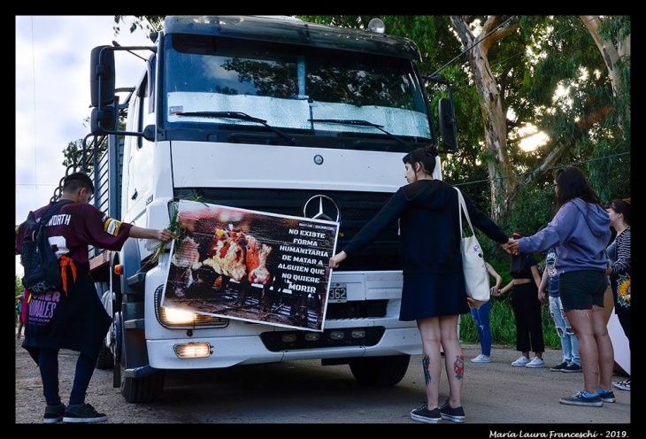 “No existe forma humanitaria de matar a alguien que no quiere morir”. Bajo este lema y varios otros con “compasión”, “explotación” y “muerte” como palabras clave, activistas veganos despidieron el fin de semana a un grupo de animales antes de su ingreso al matadero de Gorina, en La Plata.