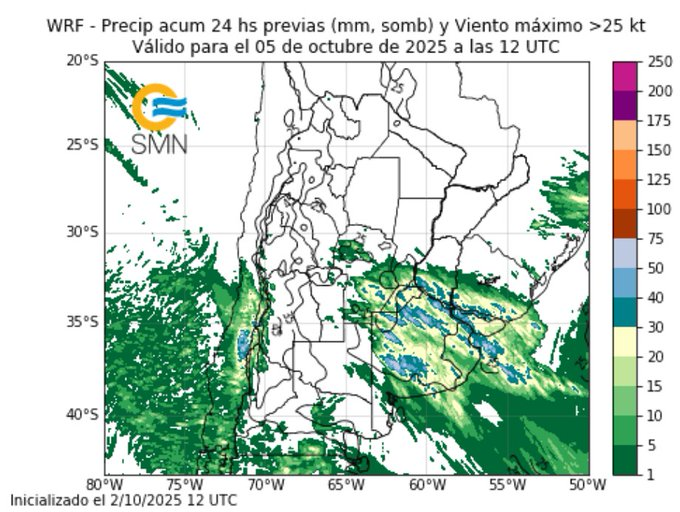Con respecto a los acumulados de lluvia, desde el SMN sostienen que se estiman entre 20 y 50 mm, aunque en sectores puntuales podrían superar los 70 mm.