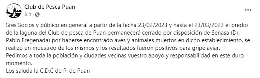 El Club de Pesca Puan, ubicado en la Laguna la Segovia, expresó en sus redes sociales que la institución permanecerá cerrada hasta el 23 de marzo por disposición del SENASA “por haberse encontrado aves y animales muertos” en el establecimiento. Además, solicitaron responsabilidad a toda la población y a las ciudades vecinas en este “duro momento”