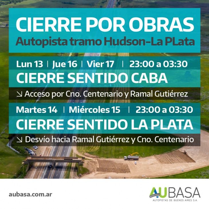 Un tramo de la Autopista La Plata – Buenos Aires sufrirá cierres parciales a partir de esta noche y hasta el viernes 17 de enero, en el marco de la nueva bajada de City Bell construida por AUBASA, que requiere tareas en el puente ubicado sobre el kilómetro 42 del camino que une a la capital bonaerense con la federal.
