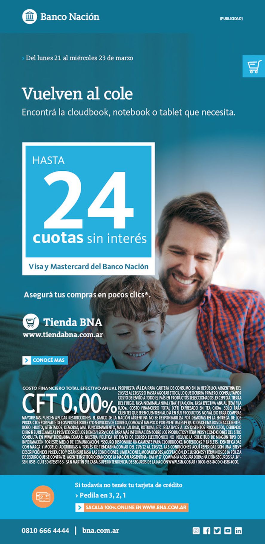 El beneficio se enmarca en la vuelta a clases y aplica a las transacciones realizadas a través de las tarjetas de crédito Mastercard y Visa por medio de TiendaBNA, plataforma desarrollada entre el banco y Nación Servicios para realizar compras online.