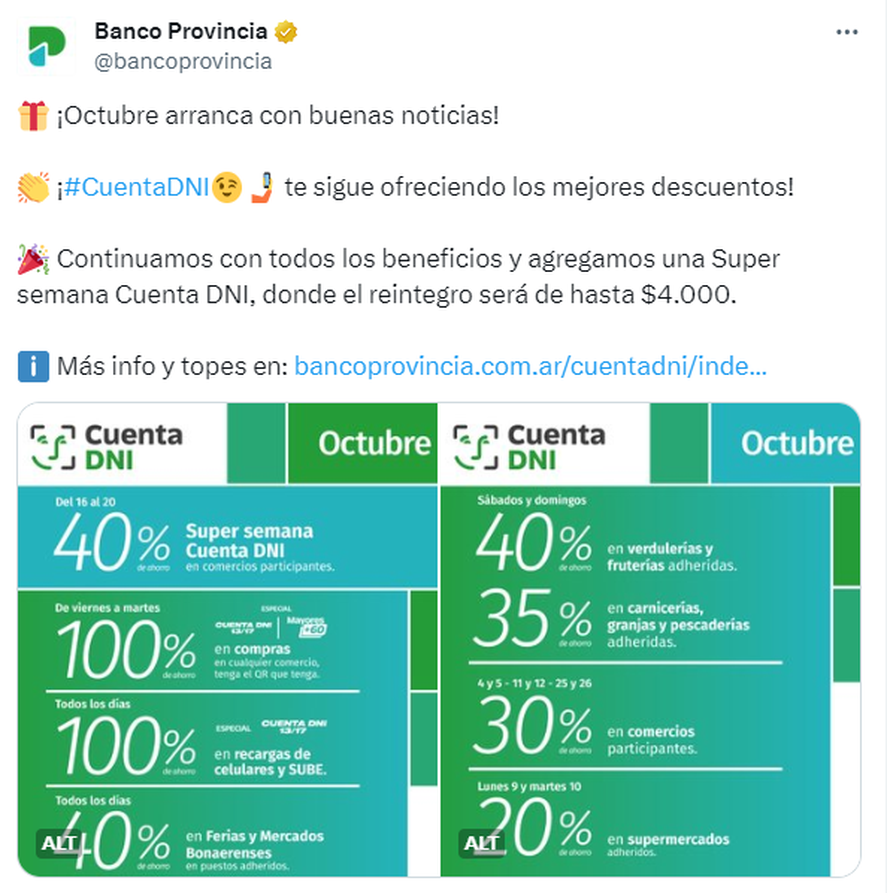 - Especial Super semana Cuenta DNI: 40% de descuento en comercios adheridos del 16 al 20 de octubre, con tope de $4.000 por vigencia y por persona.