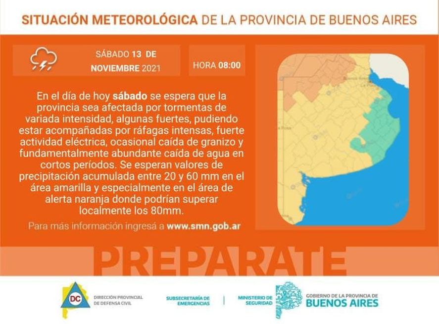 El organismo dependiente del Ministerio de Defensa informó que rige un alerta naranja para el noroeste de la Provincia, en las localidades localidades de Arrecifes, Capitán Sarmiento, Carmen de Areco, Chacabuco, Colón, General Arenales, General Pinto, Junín, Leandro N. Alem, Lincoln, Pergamino, Rojas, Salto, Baradero, Ramallo, San Nicolás y San Pedro.