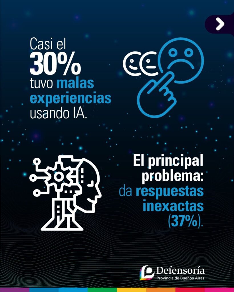 El estudio mostró que un 54% de quienes usan IA no registró problemas, pero un 26% sí afirmó haber atravesado experiencias negativas, mientras que un 20% no estuvo seguro. Entre los principales inconvenientes, se mencionaron respuestas incorrectas o inexactas (37%), expectativas incumplidas (26%), dificultades técnicas o de comprensión (20,8%) y preocupaciones sobre privacidad (13%).