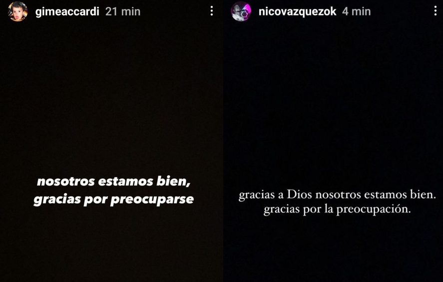 A través de sus historias de Instagram, los artistas se encargaron de llevar tranquilidad a sus seguidores y sus seres queridos. “Nosotros estamos bien. Gracias por preocuparse”, escribió Gimena. En la misma línea, Nicolás agregó: “Gracias a Dios nosotros estamos bien, gracias por la preocupación”.