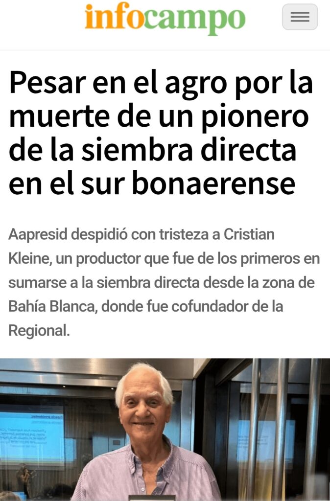 El fallecimiento de Cristian Kleine, reconocido pionero de la siembra directa en el sur bonaerense, genera un doble sentimiento en el distrito bonaerense de Tornquist. Productores y dirigentes del agro lamentan la pérdida de un referente que promovió prácticas sustentables durante casi cuatro décadas, acercando a jóvenes y estudiantes al sistema de producción más respetuoso del suelo.