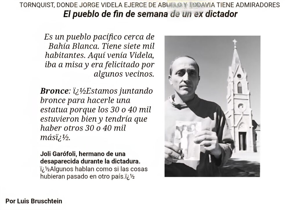 Además, la localidad de Tornquist conserva memoria viva de las tensiones de la dictadura militar y cívica de los años 70. Familias de desaparecidos, como la de Joli Garófoli, ya narraron las dificultades de convivir en un pueblo donde algunos vecinos todavía defienden públicamente el accionar de Videla y sus seguidores.