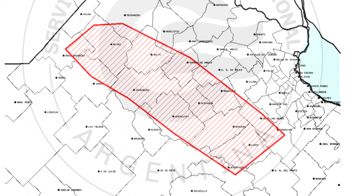 El Servicio Meteorológico Nacional emitió un comunicado por tormentas fuertes con ráfagas y posible caída de granizo que afecta a los partidos de Alberti, Arrecifes, Capitán Sarmiento, Carmen de Areco, Cañuelas, Chacabuco, Chivilcoy, Gral. Arenales, Gral. Las Heras, Junín, Lobos, Lujan, Mercedes, Navarro, Pergamino, Rojas, Roque Pérez, San Andrés de Giles, Salto y Suipacha.