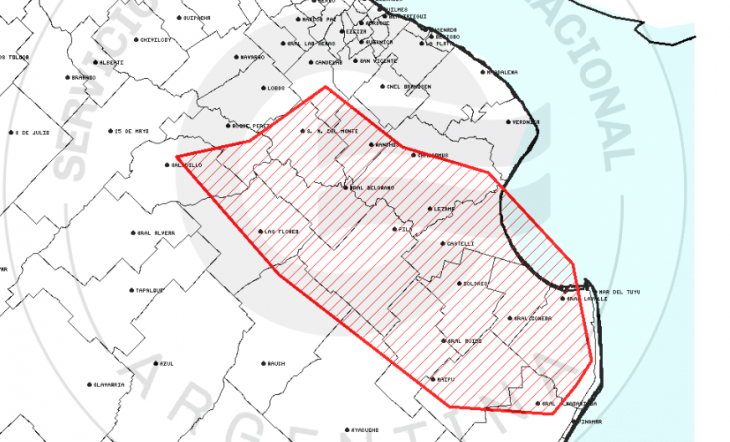 Mientras que también dio aviso de tormentas con lluvias intensas para Ayacucho, Castelli, Cañuelas, Chascomus, Dolores, Gral Belgrano, Gral Guido, Madariaga, Gral Lavalle, Gral Paz, Las Flores, Lezama , Maipu, Pila, Rauch, Roque Pérez, S. M. del Monte, Saladillo y Tordillo