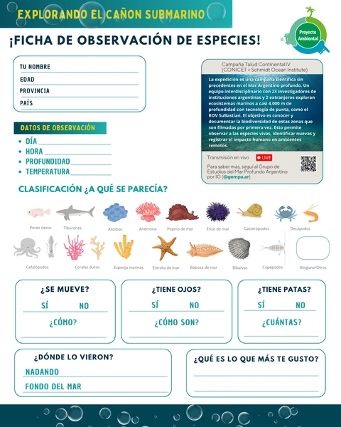 - Clasificación de especies: Espacio para identificar y anotar las criaturas que vieron durante la transmisión en vivo de la expedición.