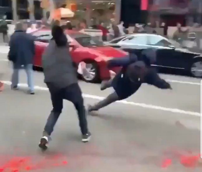 Lo contrastante del video viral de la trifulca es el paisaje que lo rodea, ni más ni menos que uno de los emblemas de “La Gran Manzana”, el famoso Times Square con sus carteles electrónicos y las marcas más famosas del mundo como fondo.