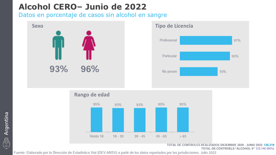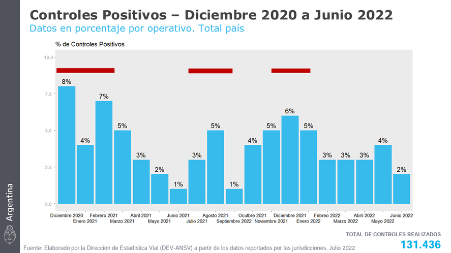 Un informe realizado por la Agencia Nacional de Seguridad Vial (ANSV), organismo dependiente del Ministerio de Trabajo de la Nación, reveló que los resultados positivos de alcoholemia bajaron desde diciembre de 2020 (8%) a junio de 2022, donde se registró un 2%. El trabajo refleja los resultados de un total de 131.436 controles en todo el país.