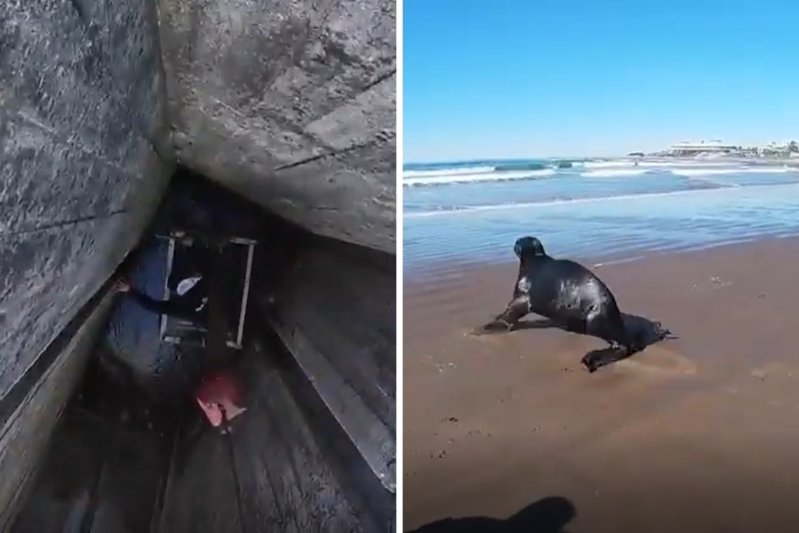 En la ciudad costera de Mar del Plata, especialistas trabajaron en el rescate de un lobo marino que quedó atrapado dentro de las instalaciones de una central eléctrica, luego de ingresar desde el mar por un túnel de refrigeración.