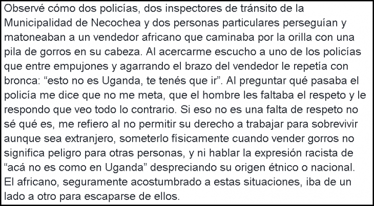 Y continuó: “Si eso no es una falta de respeto no sé qué es, me refiero al no permitir su derecho a trabajar para sobrevivir aunque sea extranjero, someterlo físicamente cuando vender gorros no significa peligro para otras personas, y ni hablar la expresión racista de ‘acá no es como en Uganda’, despreciando su origen étnico o nacional.