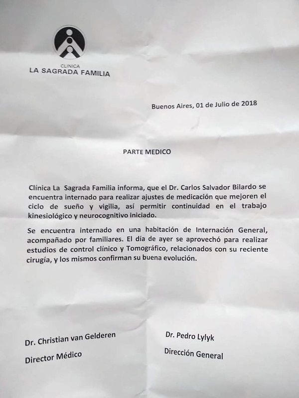 Este es el último parte médico presentado por el Sanatorio que alberga a Bilardo que en su momento recibió un mensaje de apoyo del propio Jorge Sampaoli.