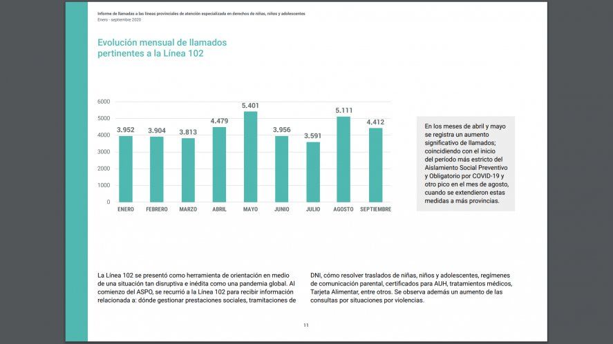 Un informe estadístico publicado la Secretaría Nacional de la Niñez, Adolescencia y Familia (SENAF) indica que, entre enero y septiembre de 2020, se recibieron 38.619 llamadas a las líneas 102, que brindan un servicio telefónico gratuito y confidencial de escucha, contención y orientación para niños, niñas y adolescentes al que también se puede llamar ante situaciones de vulneración de sus derechos.