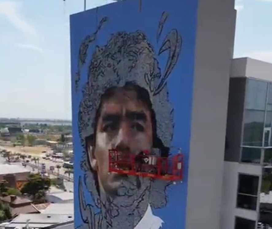 El artista Maximiliano Bagnasco (@maxibagnascook) estรก finalizando un gigantesco mural con la imagen de Diego Maradona sobre uno de los laterales de un moderno edificio en la localidad bonaerense de Canning.