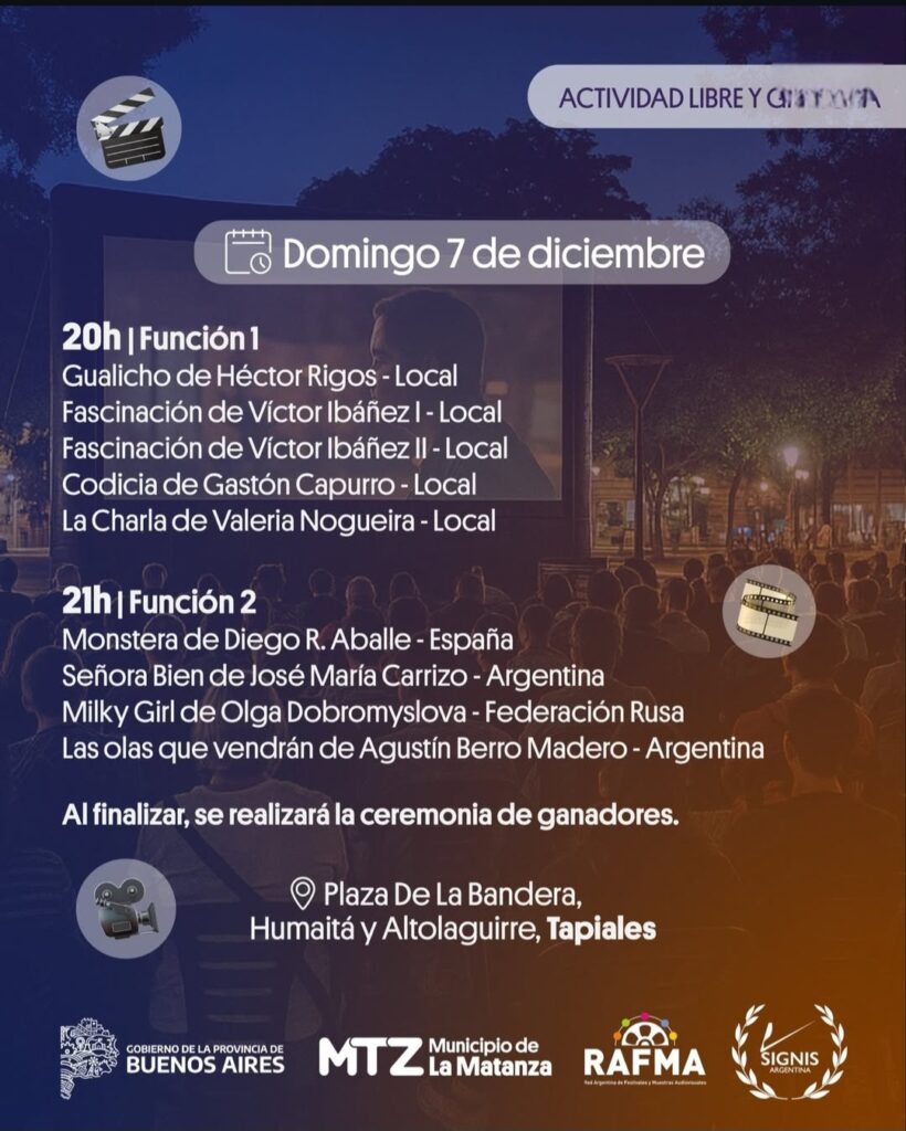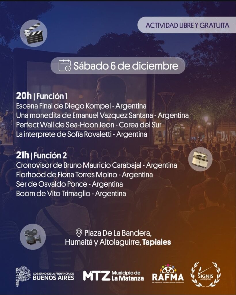 La localidad de Tapiales, en el partido de La Matanza, llevará adelante la 22ª edición del Festival Internacional de Cine Corto de Tapiales del 5 al 7 de diciembre. Las funciones serán de acceso libre en el Teatro Leopoldo Marechal de Ramos Mejía y en La Plaza de la Bandera, ubicada en Humaitá y Altolaguirre.