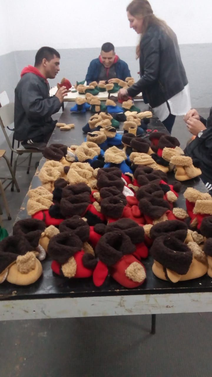 Las pantuflas se fabricaron en el curso de Armador de Calzado que se desarrolla los lunes y miércoles de 8.30 a 12 y que cuenta con 12 participantes. Los detenidos hicieron los cortes y el armado con polar y corderito y base de goma eva y la docente del curso, Ivana Rill, las cosió dándoles la caracterización de pequeños perros.