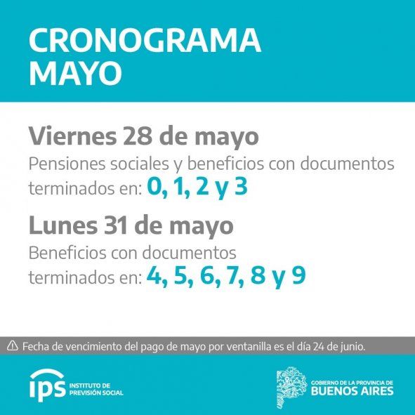 - Viernes 28 de mayo: se abonarán las pensiones sociales y los beneficios a las personas con documentos terminados en 0, 1, 2 y 3.