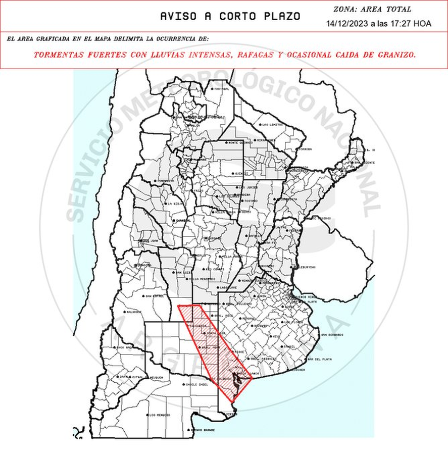 La alerta naranja que regirá durante el jueves 14 de diciembre, trae tormentas, algunas localmente fuertes, que estarán acompañadas de intensas ráfagas, ocasional caída de granizo, fuerte actividad eléctrica y abundante caída de agua en cortos períodos. Desde el SMN se prevén valores de precipitación acumulada entre 60 y 100 mm, pudiendo ser superados localmente.