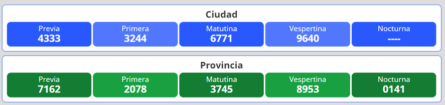 La Loterรญa ofrece cuatro sorteos diarios de lunes a sรกbados. La Primera es a las 11.30 horas; Matutino a las 14:00 horas, Vespertino a las 17.30 horas y Nocturno a las 21:00 horas.