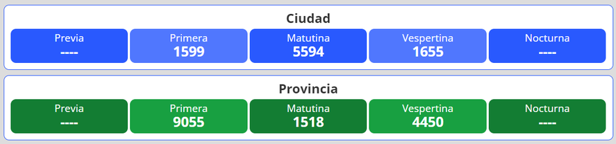 La Lotería ofrece cuatro sorteos diarios de lunes a sábados. La Primera es a las 11.30 horas; Matutino a las 14:00 horas, Vespertino a las 17.30 horas y Nocturno a las 21:00 horas.