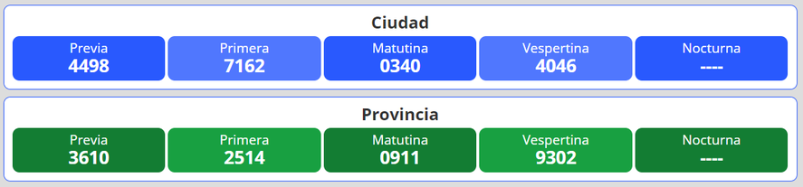 La Lotería ofrece cuatro sorteos diarios de lunes a sábados. La Primera es a las 11.30 horas; Matutino a las 14:00 horas, Vespertino a las 17.30 horas y Nocturno a las 21:00 horas.