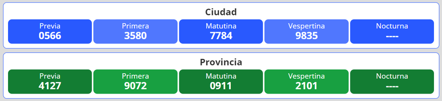 La Loterรญa ofrece cuatro sorteos diarios de lunes a sรกbados. La Primera es a las 11.30 horas; Matutino a las 14:00 horas, Vespertino a las 17.30 horas y Nocturno a las 21:00 horas.