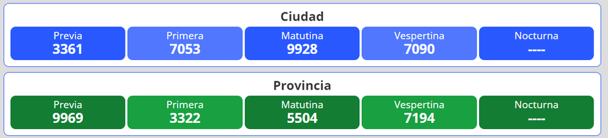 La Loterรญa ofrece cuatro sorteos diarios de lunes a sรกbados. La Primera es a las 11.30 horas; Matutino a las 14:00 horas, Vespertino a las 17.30 horas y Nocturno a las 21:00 horas.