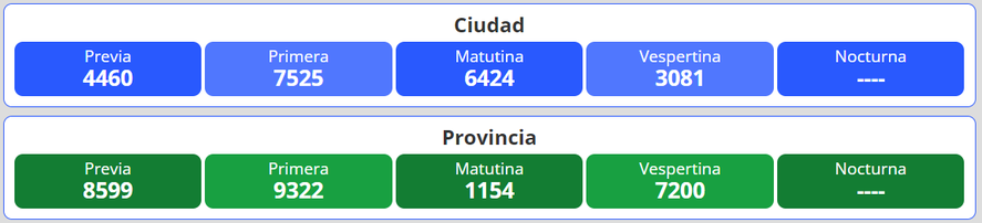 La Loterรญa ofrece cuatro sorteos diarios de lunes a sรกbados. La Primera es a las 11.30 horas; Matutino a las 14:00 horas, Vespertino a las 17.30 horas y Nocturno a las 21:00 horas.