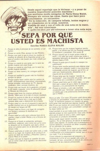 María Elena Walsh, además publicó otros artículos, como en la Revista Humor, donde recurrió justamente al discurso humorístico como una forma de cuestionar al machismo y problematizar las desigualdades entre el hombre y la mujer, con 24 motivos que señalan “por qué usted es machista”
