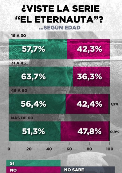 El número de entre 46 a 60 también es significativo, ya que más de la mitad (56,4%) vieron El Eternauta. Y lo mismo sucede con los mayores de 60 (51,3%).