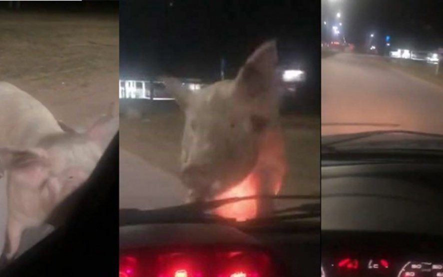 Una extraño episodio tuvo lugar anteanoche en la avenida Cabrera de Bahía Blanca: cuando una automovilista detuvo su auto en un semáforo, un cerdo que deambulaba en el lugar comenzó a seguirla y hasta se apoyó sobre el capó del vehículo.